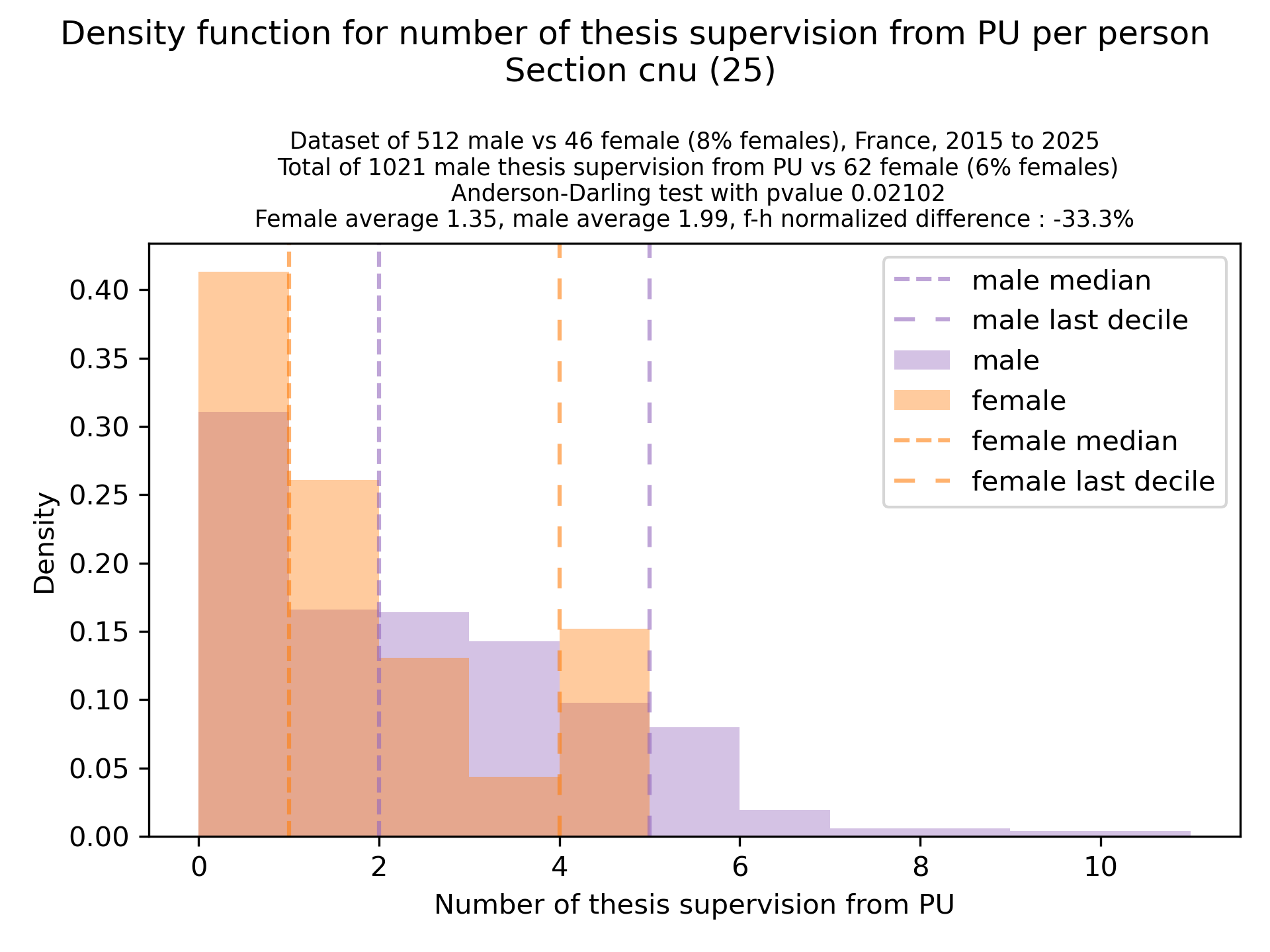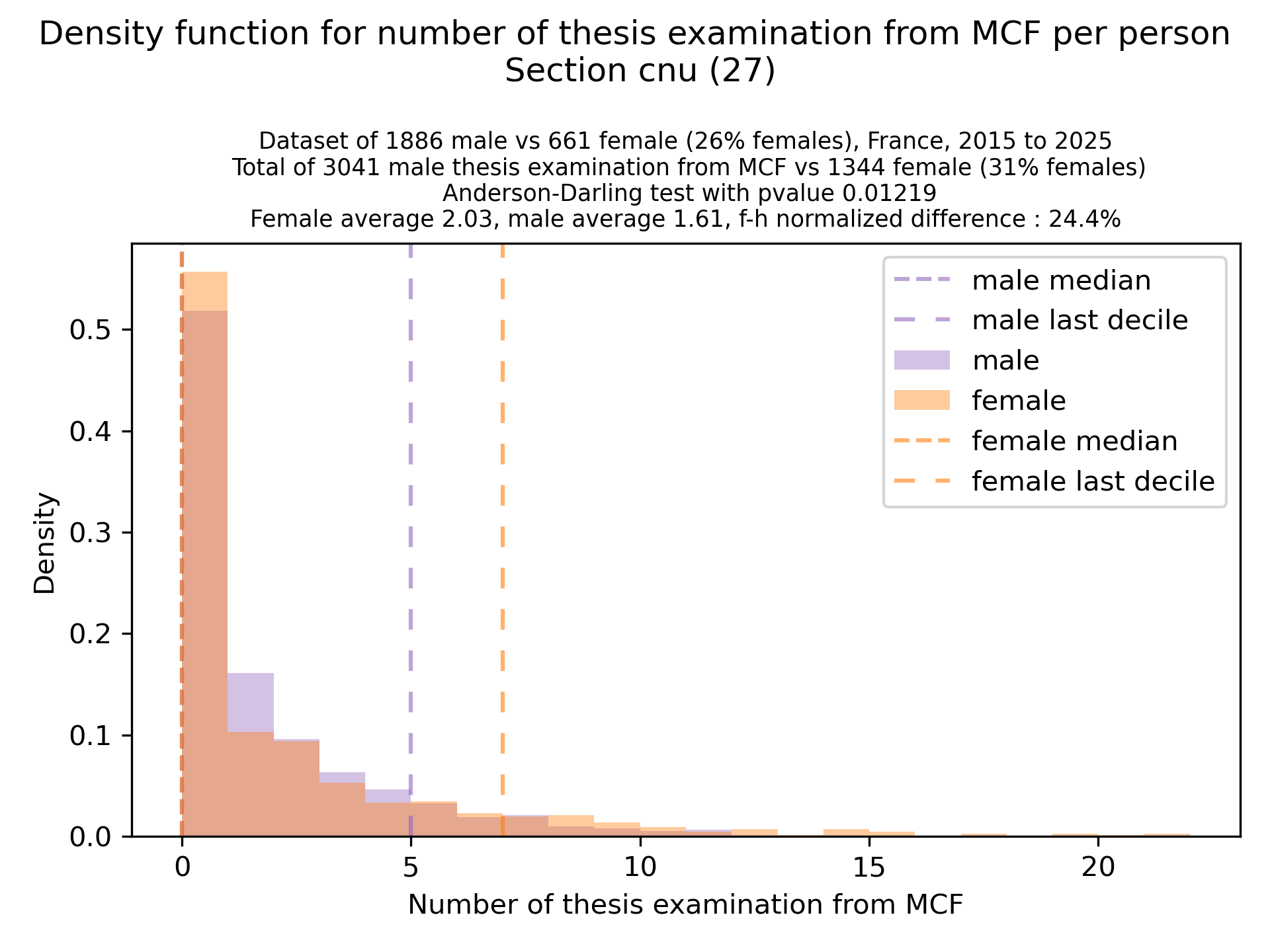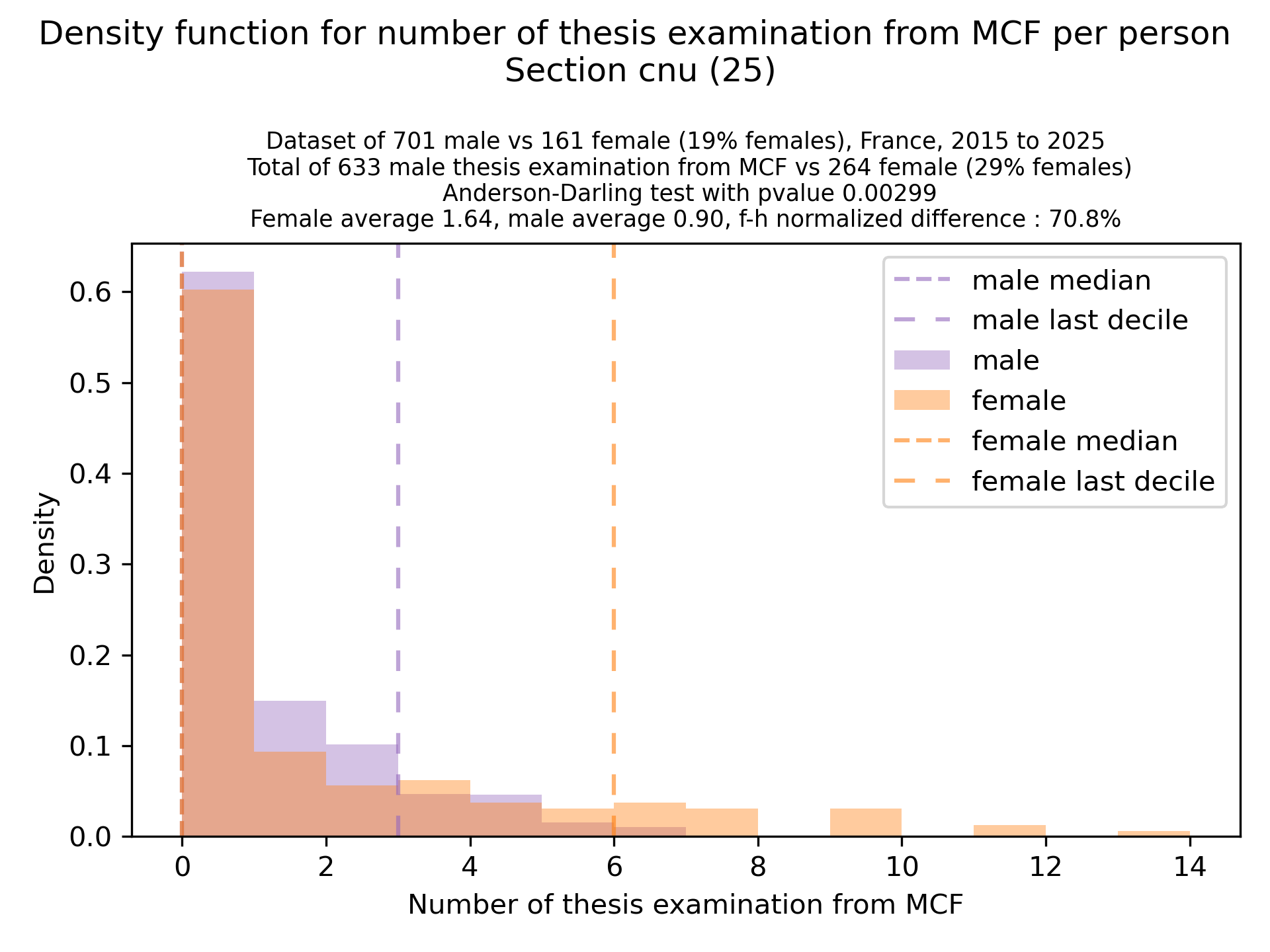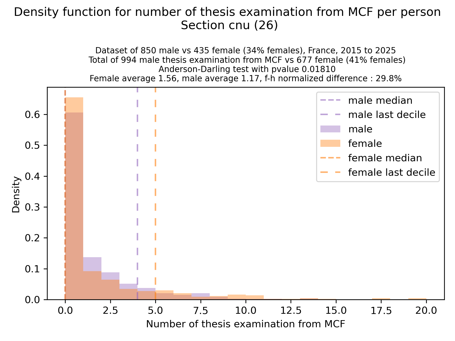 The plots below are density functions (the area below the lines sum to 1). On the first one, we for instance see that way more women than men in proportion never do any thesis jury (the red bar is bigger than the purple one at 0), and that the last decile is way higher for women. For each effect, we put the most striking graph first.