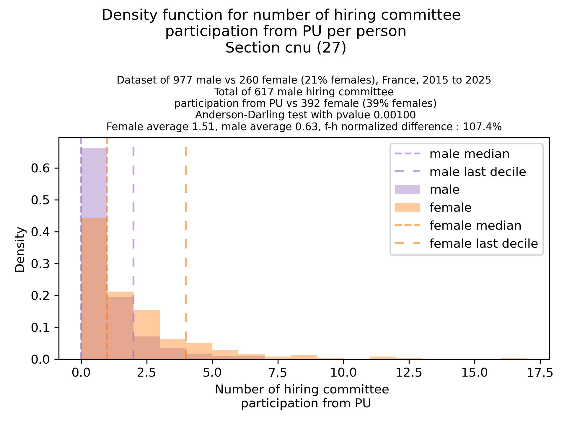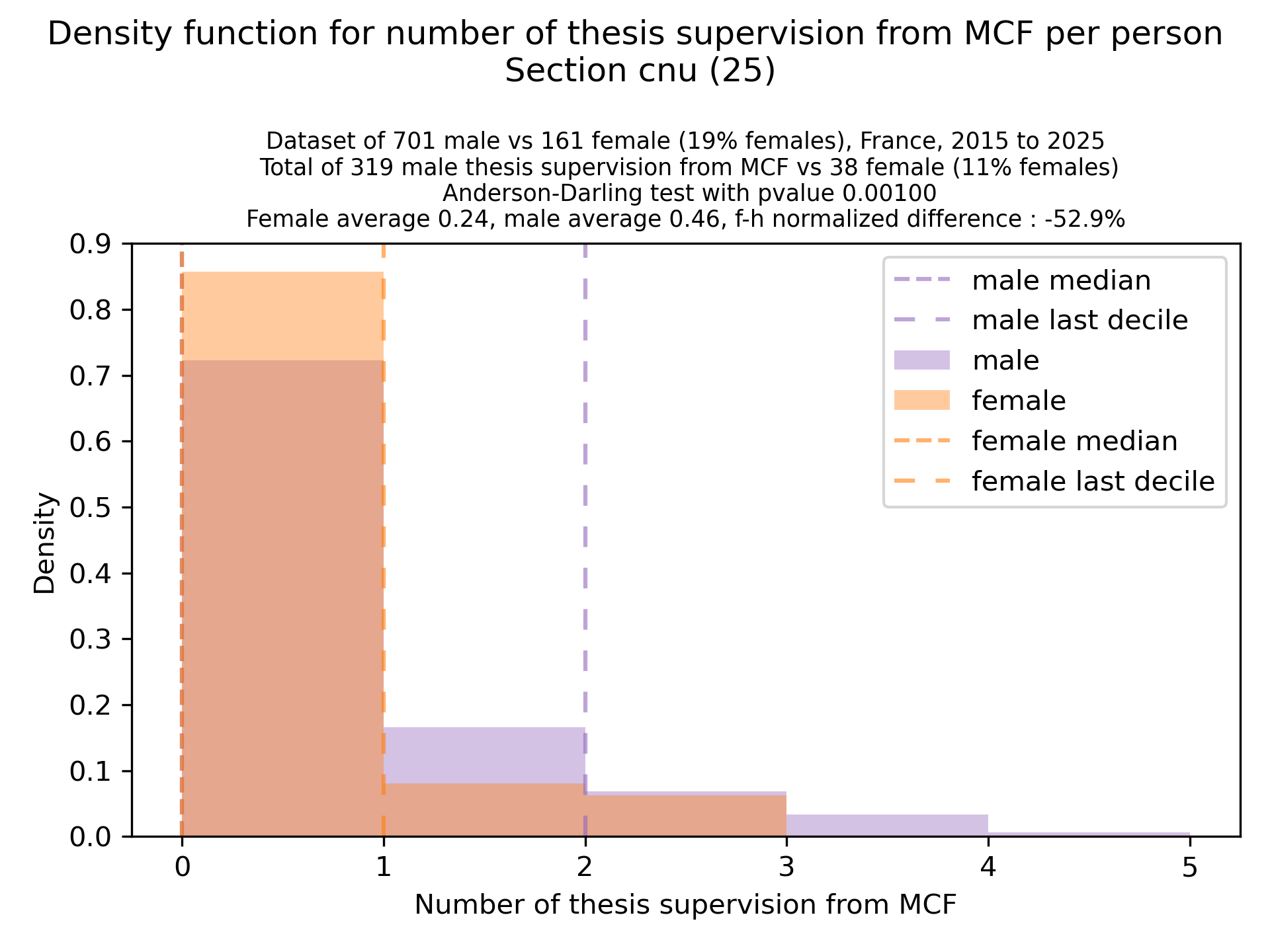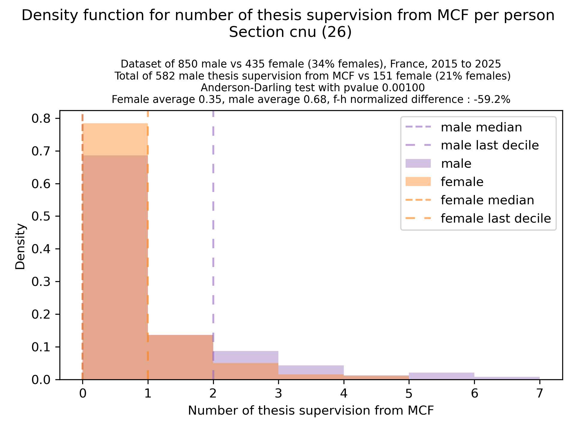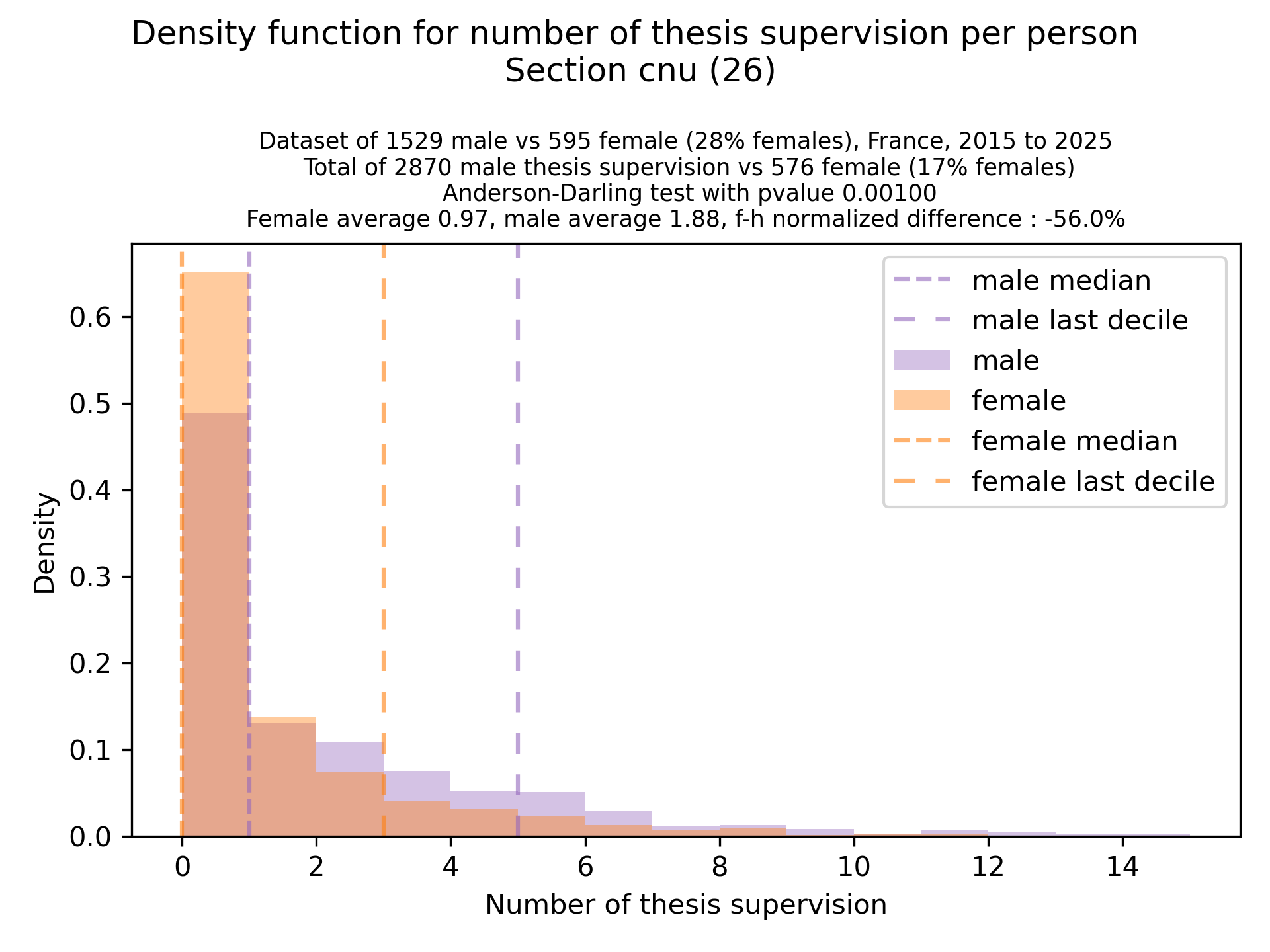 The plots below are density functions (the area below the lines sum to 1). On the first one, we for instance see that way more women than men in proportion never do any thesis jury (the red bar is bigger than the purple one at 0), and that the last decile is way higher for women. For each effect, we put the most striking graph first.