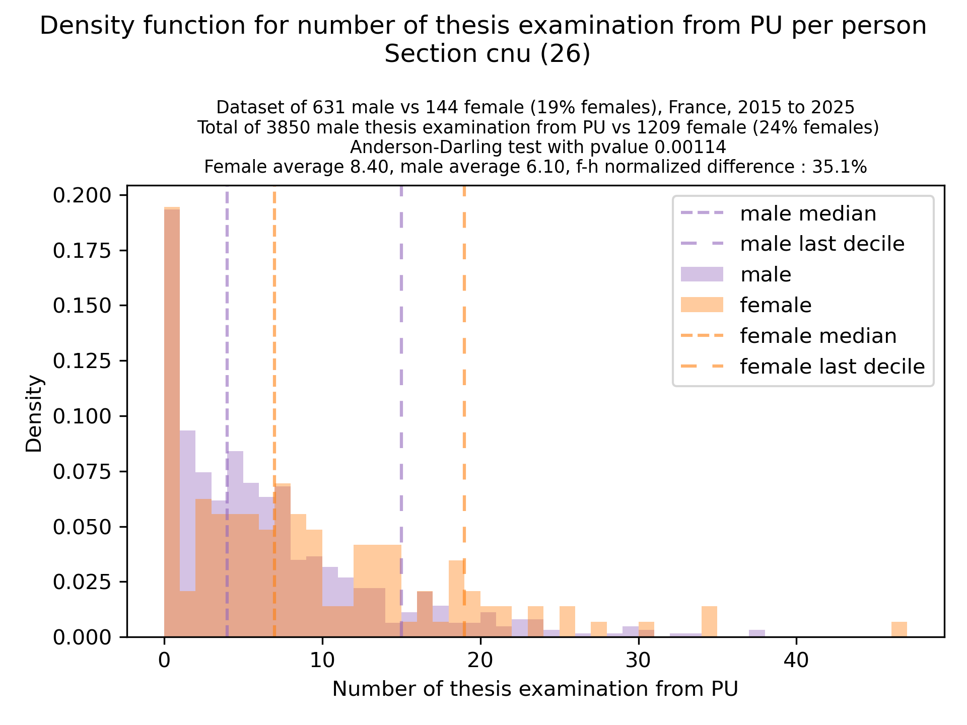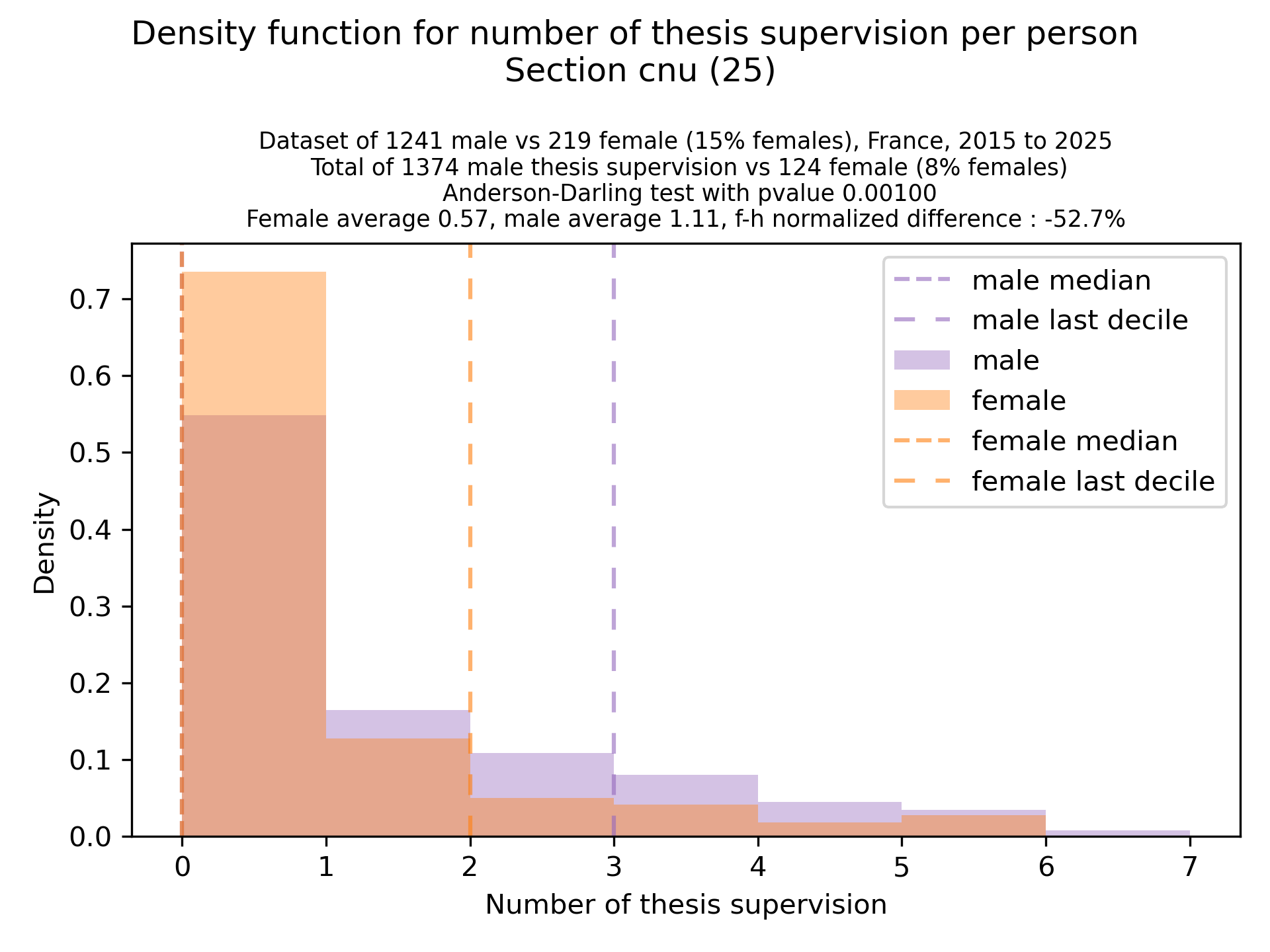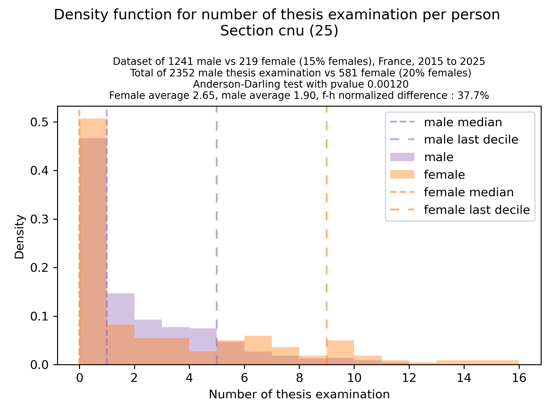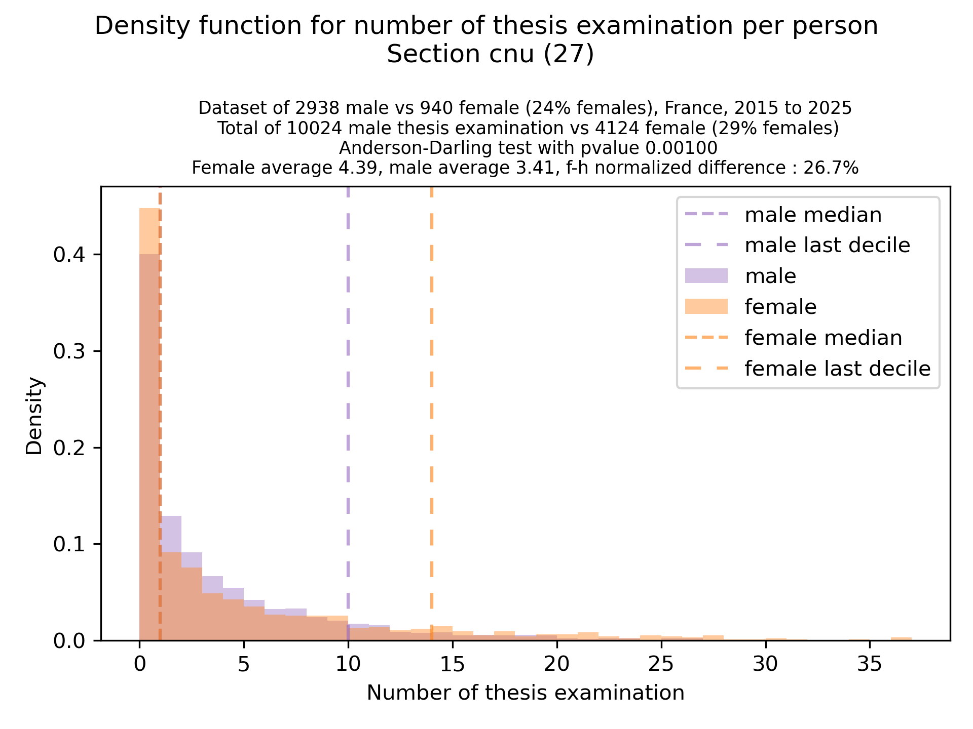 The plots below are density functions (the area below the lines sum to 1). On the first one, we for instance see that way more women than men in proportion never do any thesis jury (the red bar is bigger than the purple one at 0), and that the last decile is way higher for women. For each effect, we put the most striking graph first.