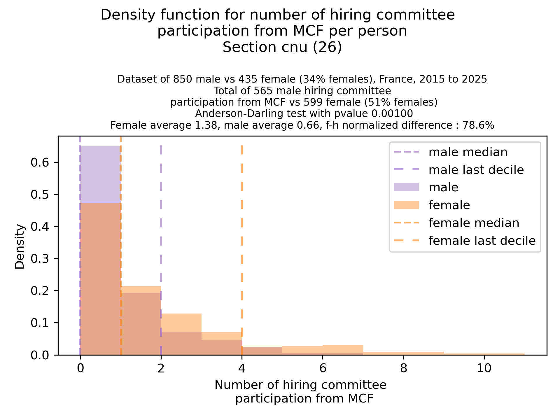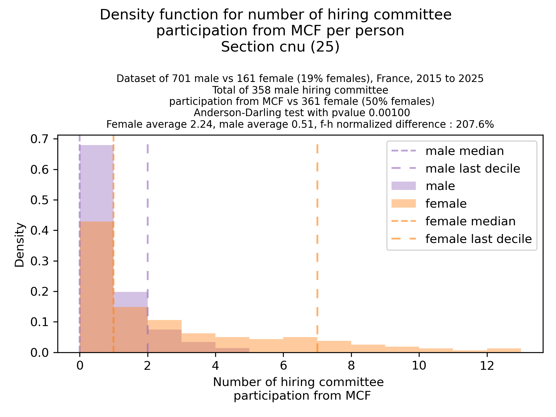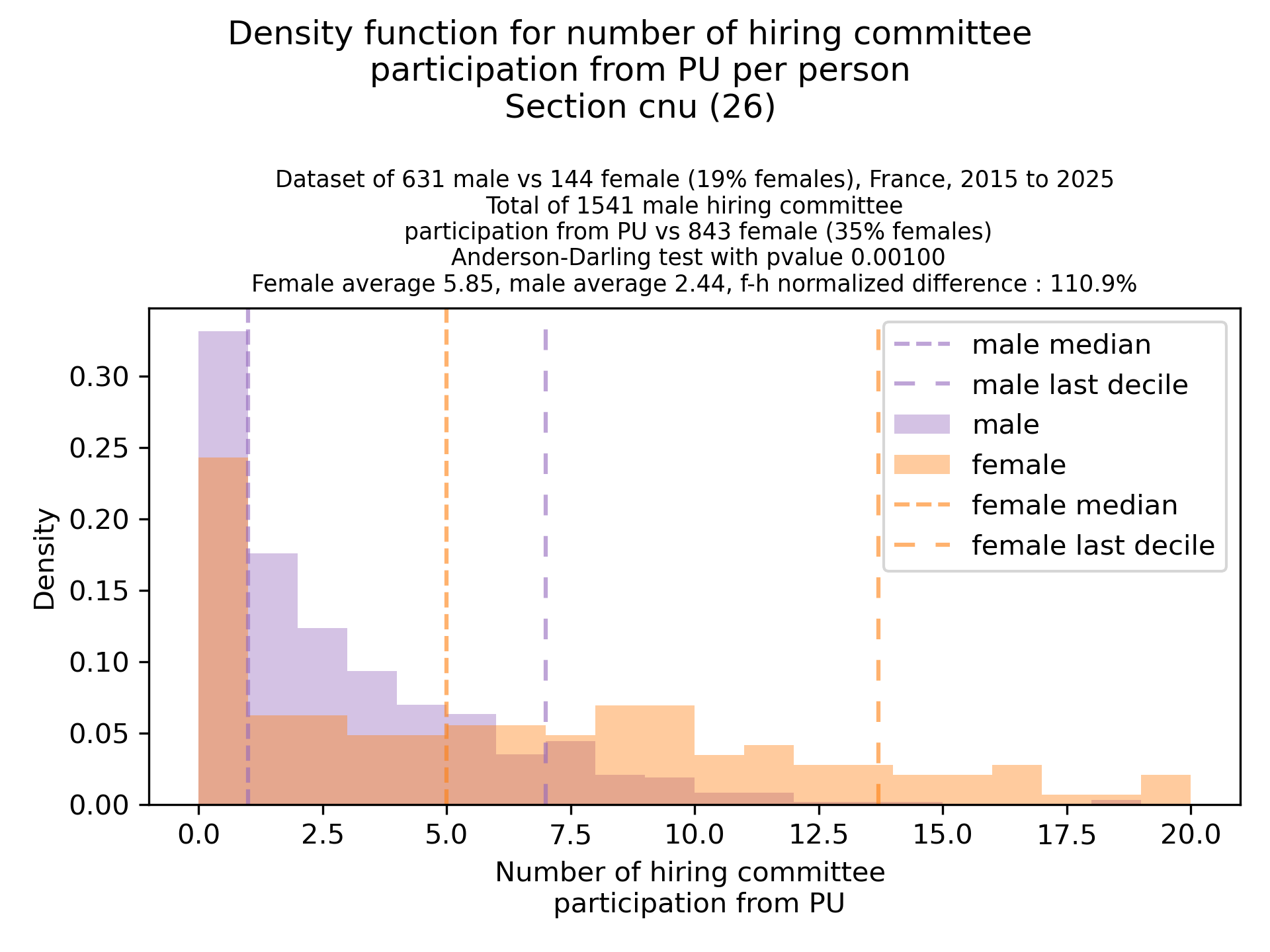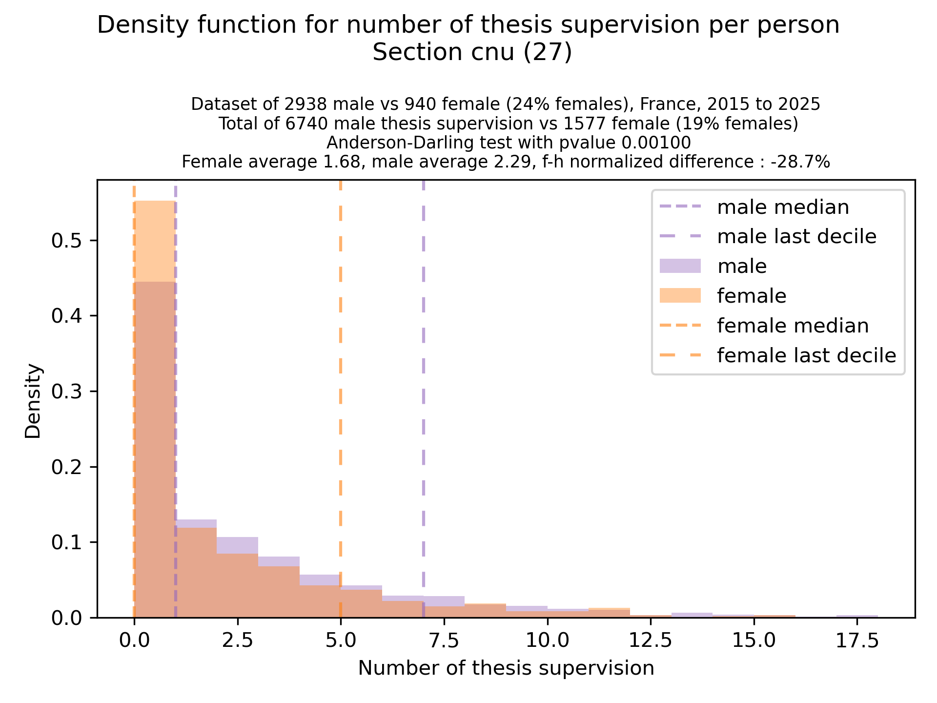 The plots below are density functions (the area below the lines sum to 1). On the first one, we for instance see that way more women than men in proportion never do any thesis jury (the red bar is bigger than the purple one at 0), and that the last decile is way higher for women. For each effect, we put the most striking graph first.