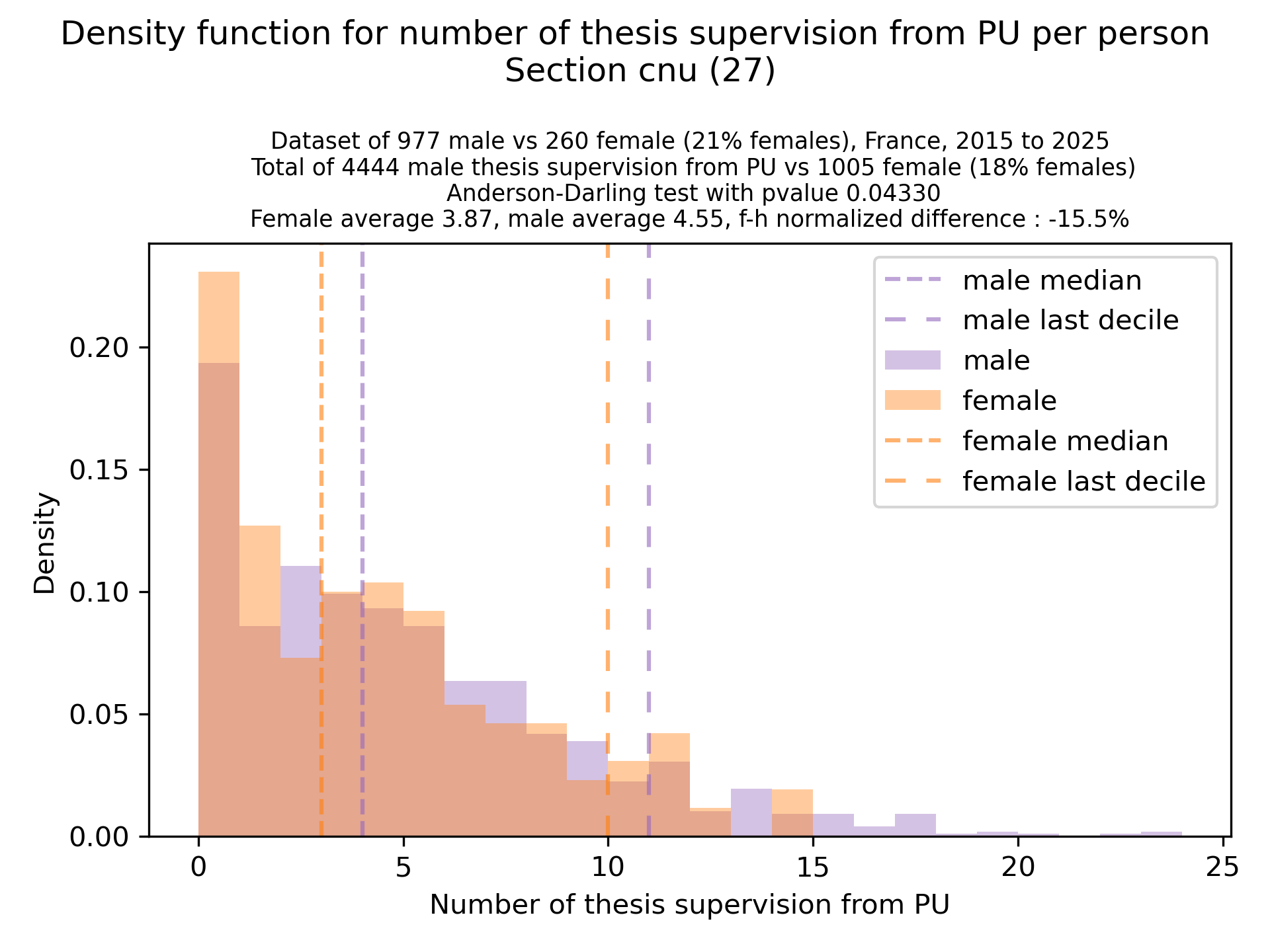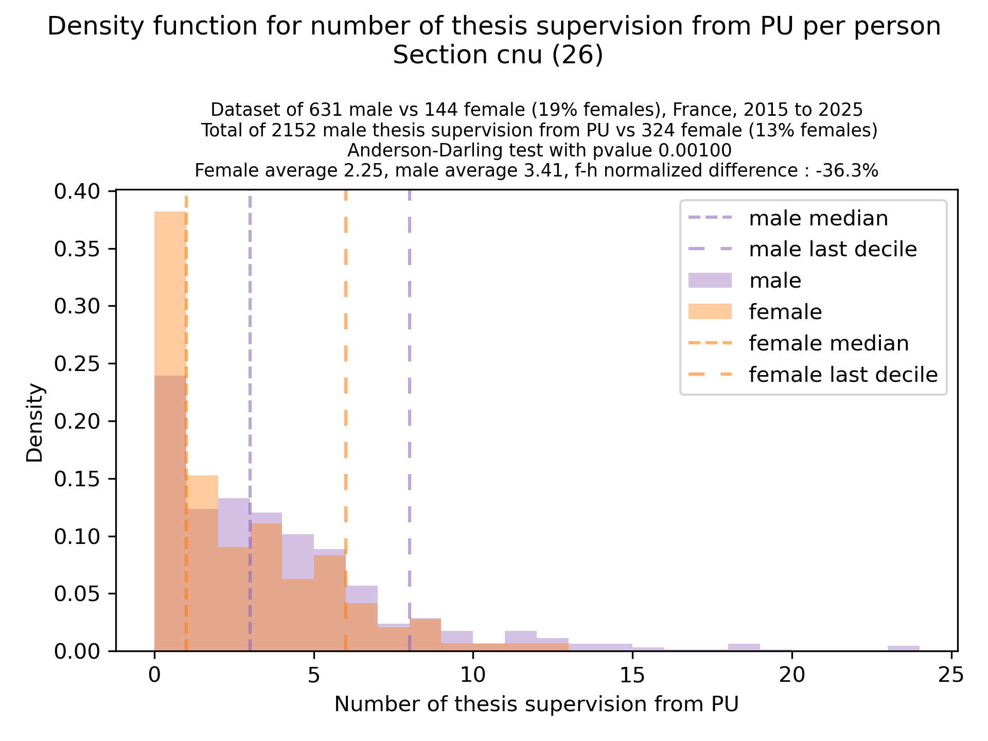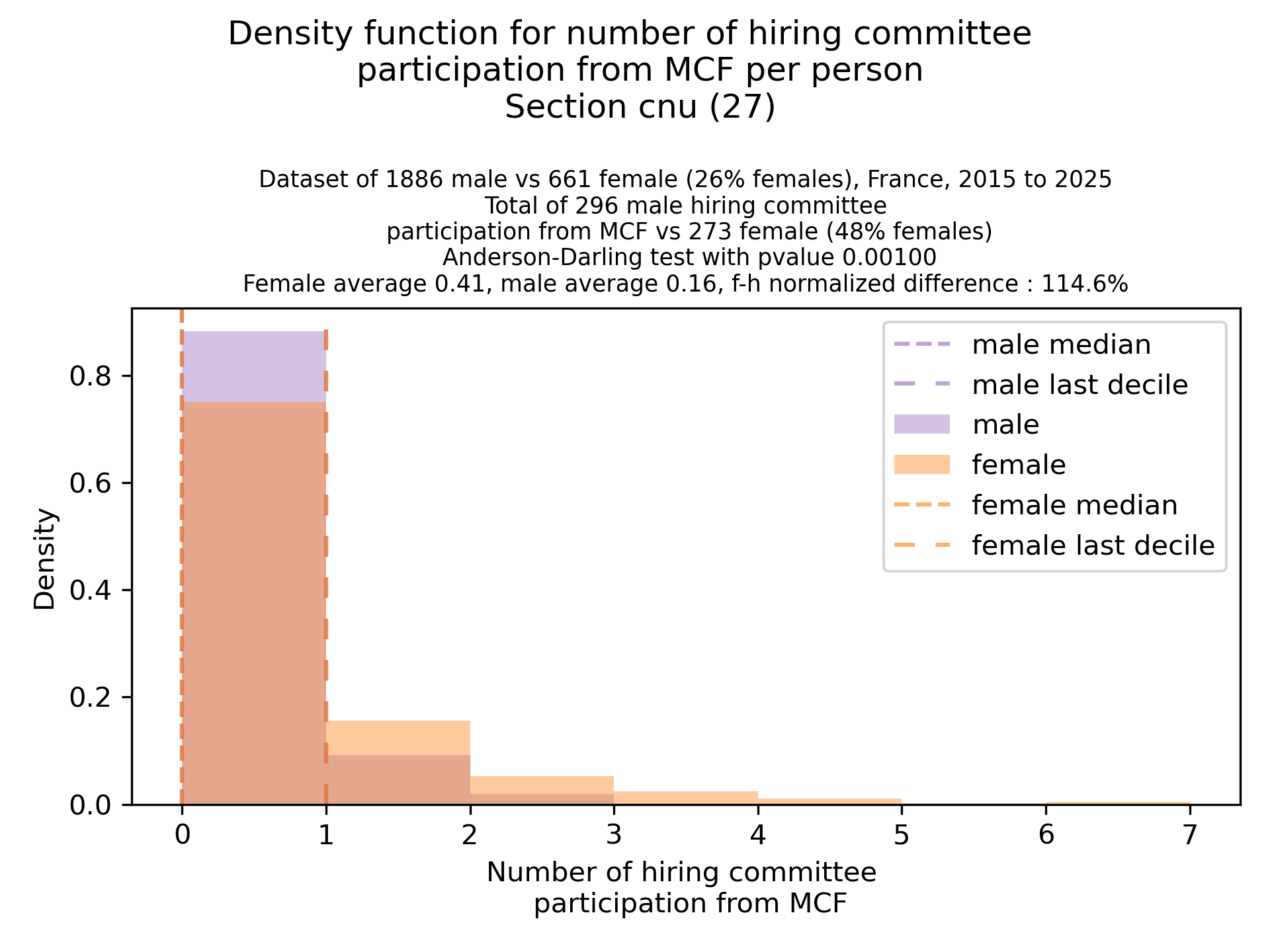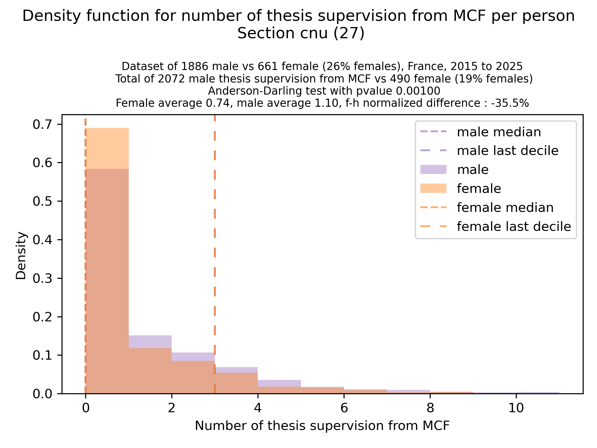 For linking a name from the electoral body listing to a theses.fr identifier, we match by full name and use for homonyms the person with the most activity as a link. For women that may take their husband names upon mariage, we lose precision, and we notice that at the PU rank, we don’t find matches for ~28% of PU women, vs ~15% for PU men (similar accross sec 25,26,27). For PU in sections 25/26/27, we did a manual pass to match more people, and reached a similar ratio as for men. This only affected the bar at 0 of corresponding graphs, keeping the rest of the distribution shape similar. At MCF rank, there is not significant difference in loss between male/females, so a manual pass is not needed to preserve the results (and nicely so, because a manual pass there becomes complicated…).
