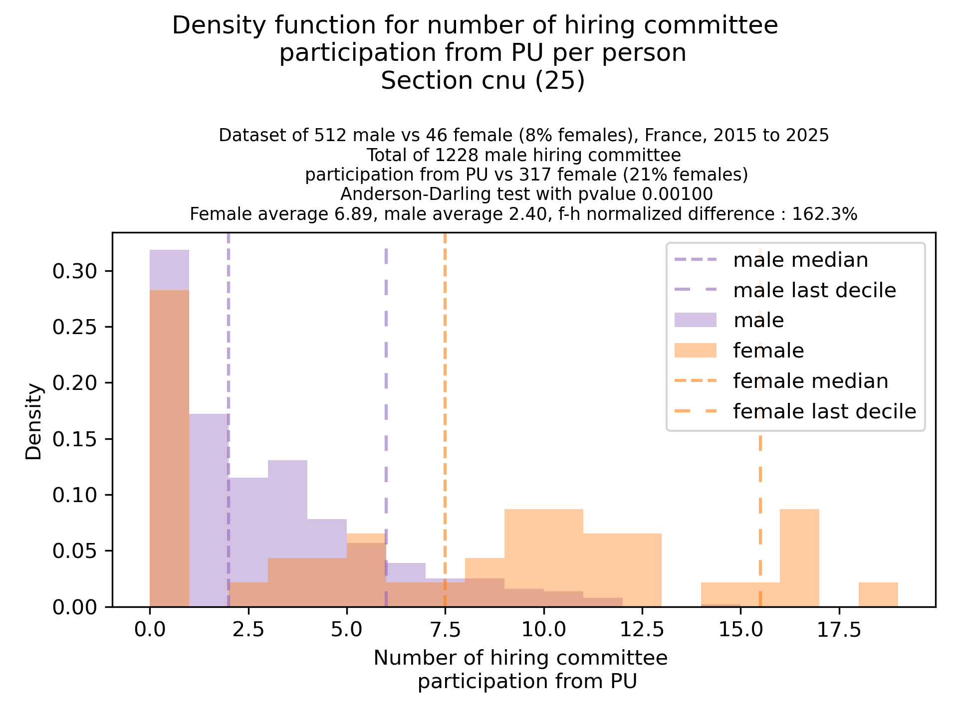 The french law for hiring committees enforces a 40% proportion of women. So, as expected, we see an unfair burden on women. However, across all sections, we observe an unfair repartition whitin women, with too much pressure put on too few women. The effect is most striking for PU in sec 25 and 26, and more reasonable for section 27. However, note that for section 27, the results are very innacurate (see Methodology below), almost half of the data is missing, which could fully invisibilize the targetted effect.