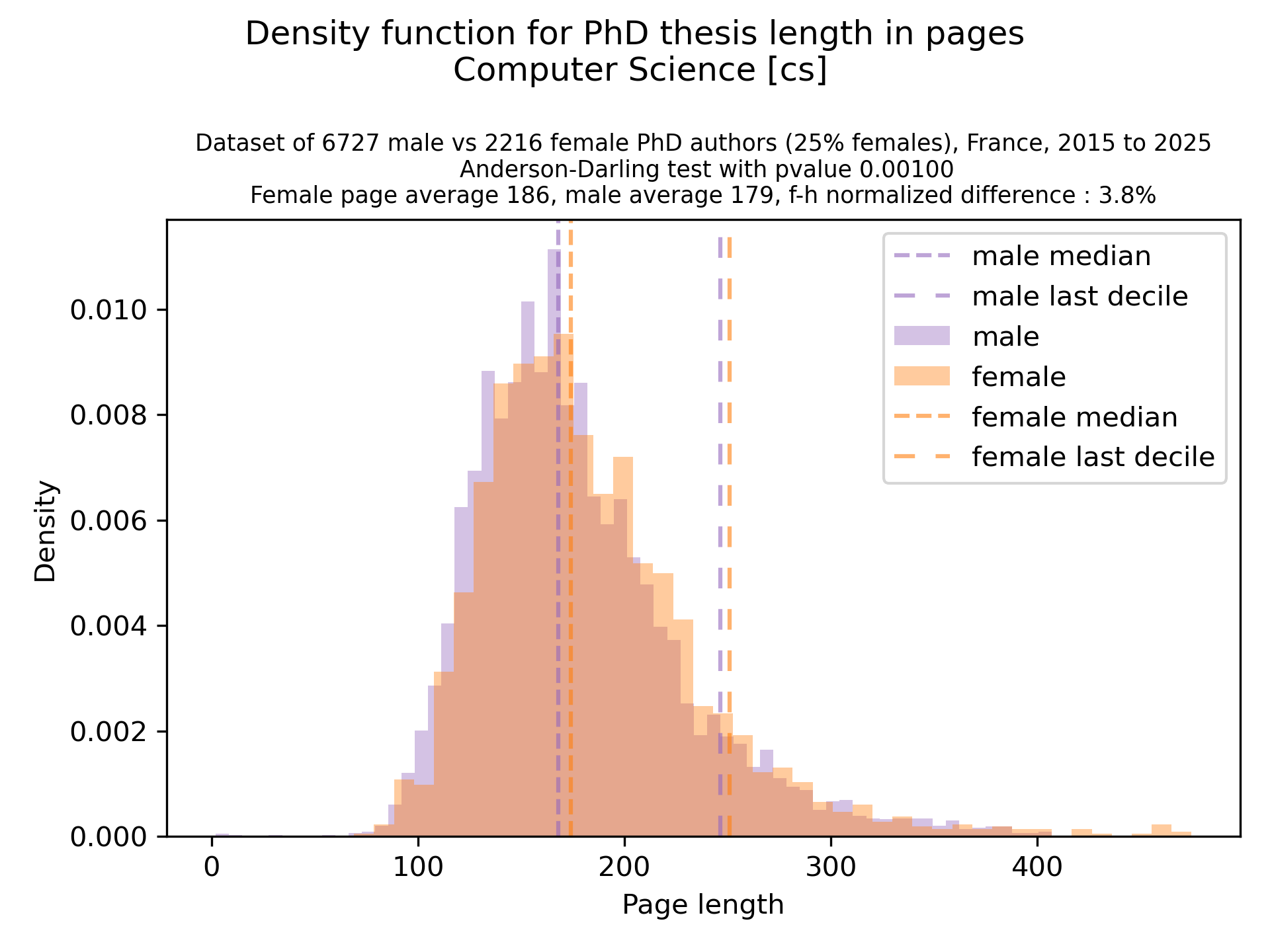 - Effect 3: Women’s PhD thesis (in number of pages) are slightly longer than men (on average 7 pages longer out of 180).