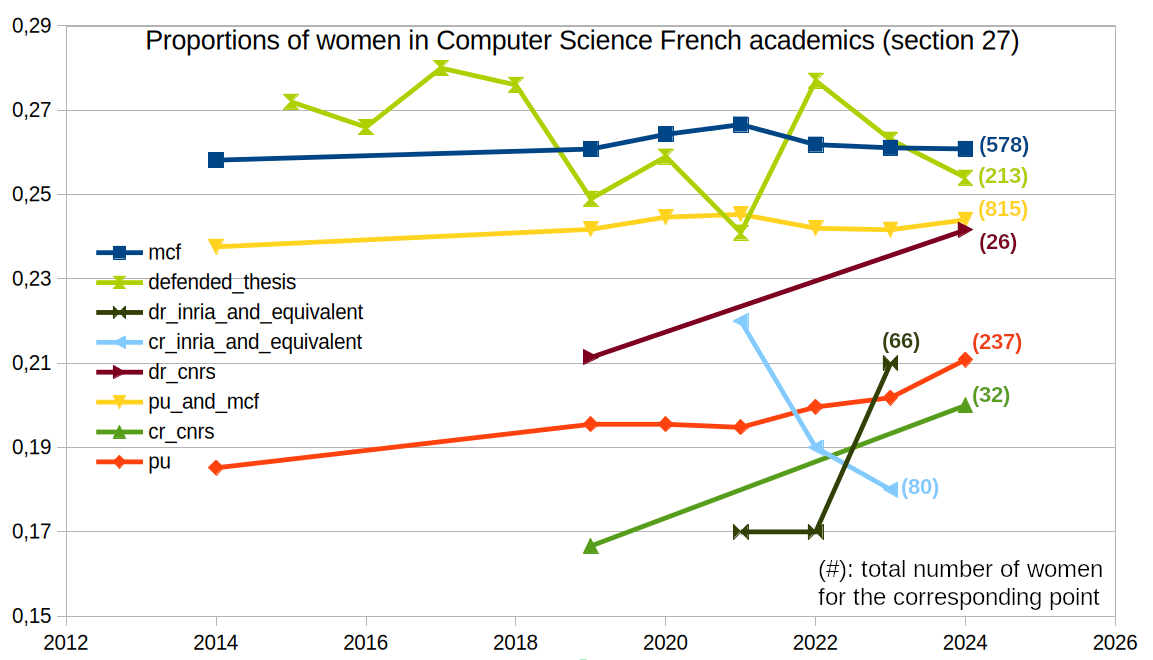 Focusing on the yellow line, we see that for the last 10 years, there is a stable ratio of ~24% of women in permanent positions in the computer sciecne frenc academia.