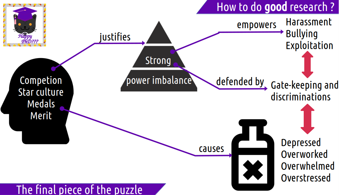 Many studies, internationaly or nationaly, demonstrate that the academic world suffers from discriminations, harrasment and unwell-being issues. It can be difficult to clearly acknowledge this and take actions against it, and it is of course even harder when we are in vulnerable positions and/or suffer from such issues directly. Trying to follow a researcher approach and notably using scientific references whenver possible, this talk will gather as many evidence as possible on those subject, and try to discover through several hypothesis what, if any, are the root causes for those issues in the academic world. We will highlight that the causes are not only external and outside of our controls: equipped with a good understanding of the issues, it is possible to act against those issues, as researchers and within our labs. We will focus on concrete possible actions that can help both witnesses and targets of dangerous situations happening right now to manage the emergency, but also on actions and policies that can help build an environnment and a culture where such situations do not happen anymore, presenting concrete actions that can be taken, at all levels of the hierarchy: as a PhD student, as a permanent researcher, as an advisor, as a head of lab, and as a hiring committee member.